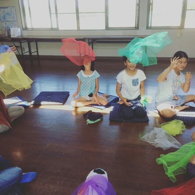 いろんな色のオーガンジーの布をふわり。秋風吹いてと歌っていたら、窓から心地よい風が吹いてきました。風にとばされる布を追いかけ、またふわりと飛ばします。