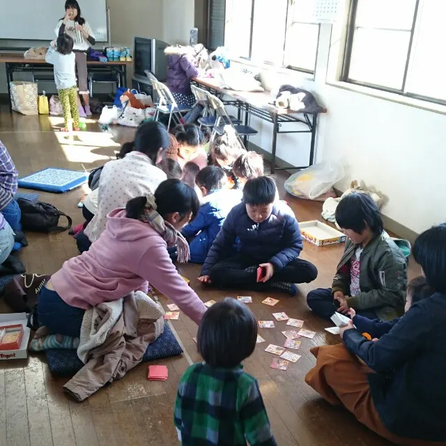 子どもたちは、頭をよせあい、異年齢でカルタ取りや、ボードゲームを楽しんでいました。 その間、大人は、山盛りのスキーウェアの中から、ウェアや、くつなどを探し、打ち合わせをしました。