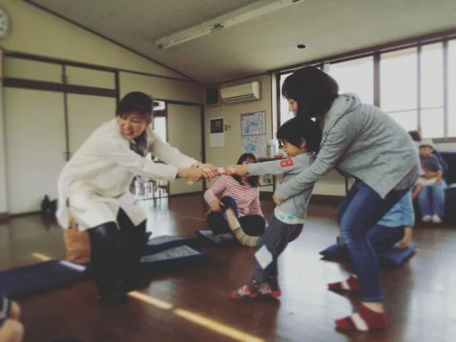 5月、初夏と言えば….. 何が思い浮かびますか? れんげ、たけのこ、こどもの日…… みなさんいろいろなものを思い浮かべたことでしょう。 今回のわらべうたは、タオルハンカチをたけのこに見たて、 ♪たけのこいっぽんおくれ のうたにあわせて、にょきにょき と生えたたけのこをひっぱりっこ。本気でひっぱらないとぬけません( ^∀^)