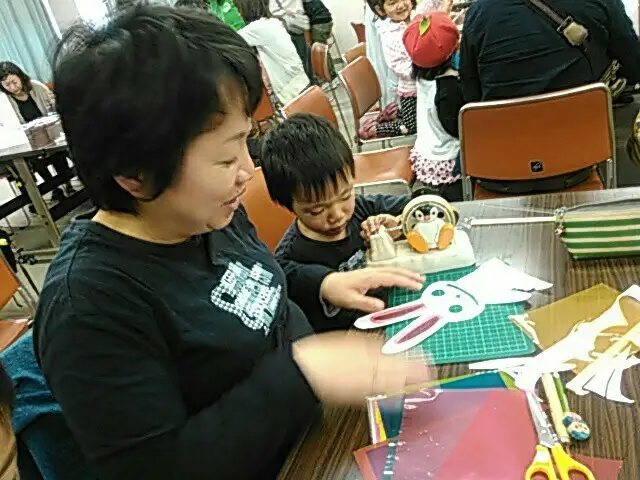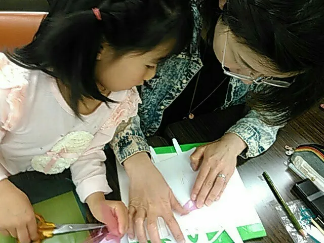 初めて使うカッターで真剣に作業する男の子。そっと見守るお母さん。