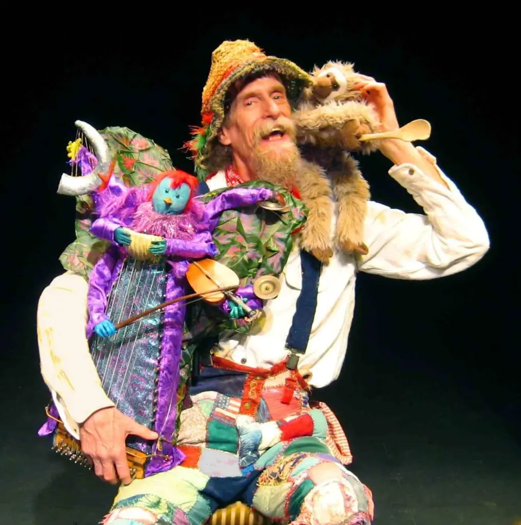 をしています。三日月形のハープを弾き、果実のバイオリン、シンバル、パンパイプ