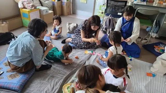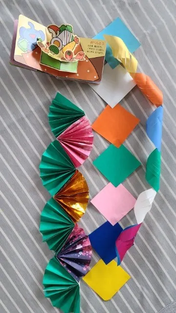 来たらすぐに、おもちゃが出ていておままごとはじまっています。赤ちゃんたちも興味のあること、皆何かに集中しています。でも絵本も聞いてくれているはず…七夕飾りを作ろうというと真剣に作ってくれています。