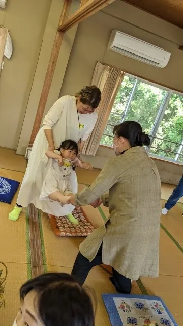 最初はいつもの「だるまさんがころんだ」や「おかごぎしぎしのりてはないか」など、先生の素敵な歌声に合わせて唄いながら子どもを膝にだっこしスキンシップしました。