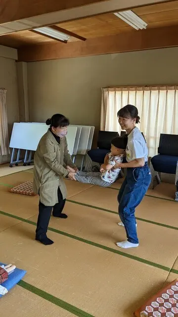 次におさるさんがでてきて揺らし、子どもたちがお母さんと植山先生に手と足を持ってもらいゆらゆら気持ちよさそうです。