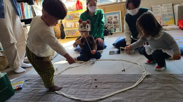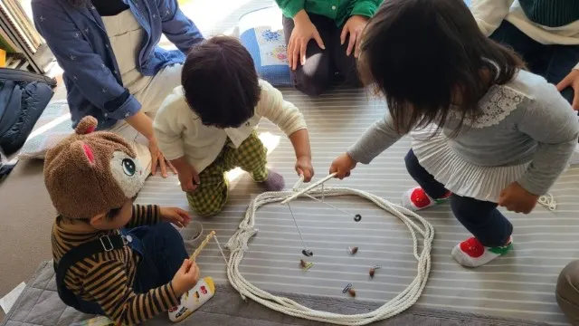 たくさんの絵本に親しんだあと、お池でどんぐり釣りをしました。最初は小さな池からだんだんと大きな池になり、3人の2歳児たちは夢中で釣っていました一番大きな池になると、池の中に入って釣り始めましたよ