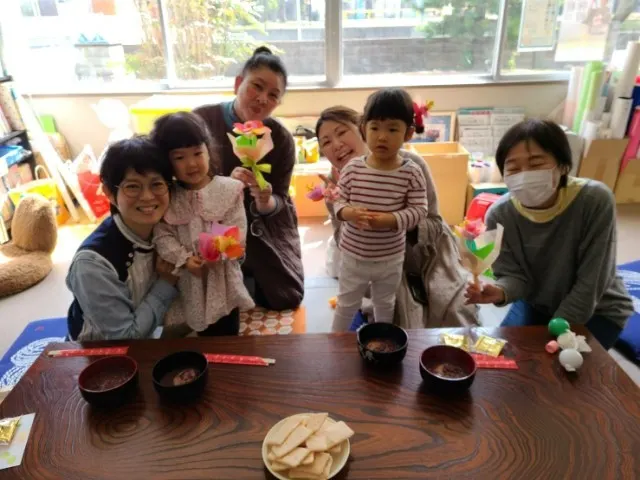 また、今回で4月から保育園に通うことになったAちゃん。さびしくなるので、旅立ちのパーティとしてUさんが餅入りぜんざいを作って来てくれました。Fさんが花束飾りの色紙などを用意してくれ、思い思いに素敵なブーケができました