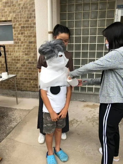@トレぺでミイラ作戦・・・どのチームが速くきれいに完成できたかな?
