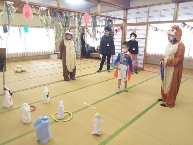 @お化けを輪投げで捕まえて、かぼちゃのボールでボーリング♪