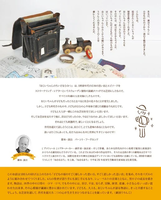 名古屋の劇団うりんこが、100人の60才以上の方から「子どもの頃の思い出」を実際に取材して丁寧に作り上げたお芝居です。シューベルトの音楽とともに、男の子の成長を描きます。子どもも、大人も、、おじいちゃんが語る物語に、きっと共感することでしょう。